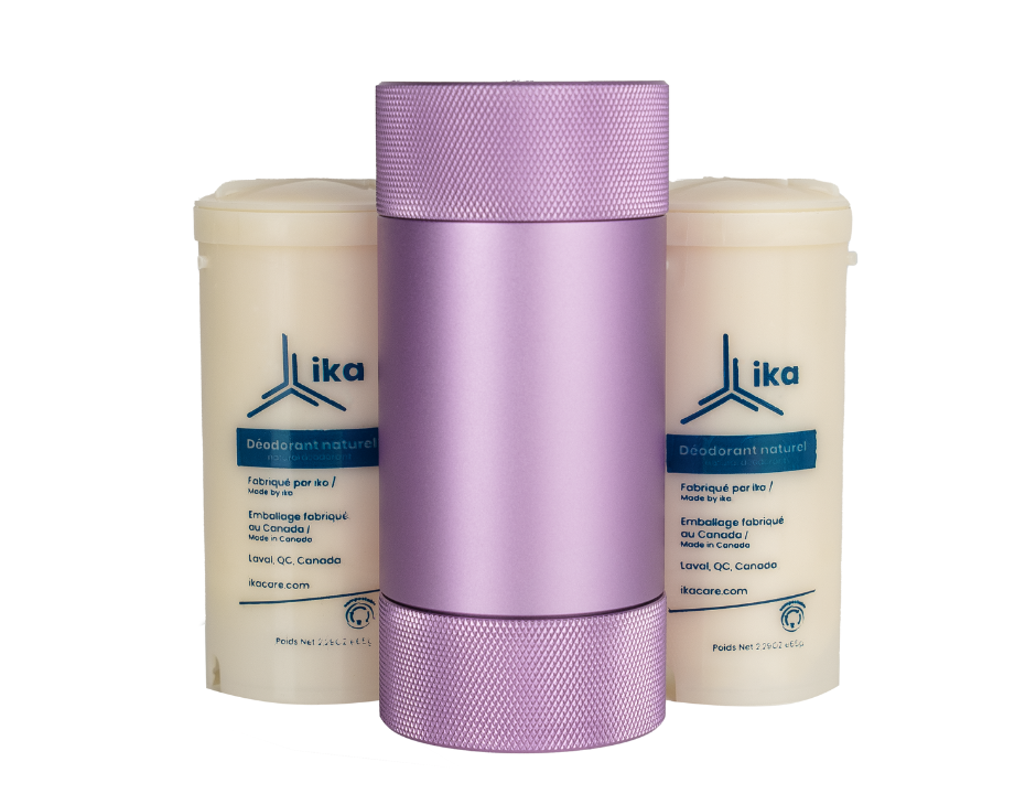 L'expérience ika commence inévitablement par l'achat de L’ensemble de départ comprenant le contenant permanent et tes deux recharges de déodorant.